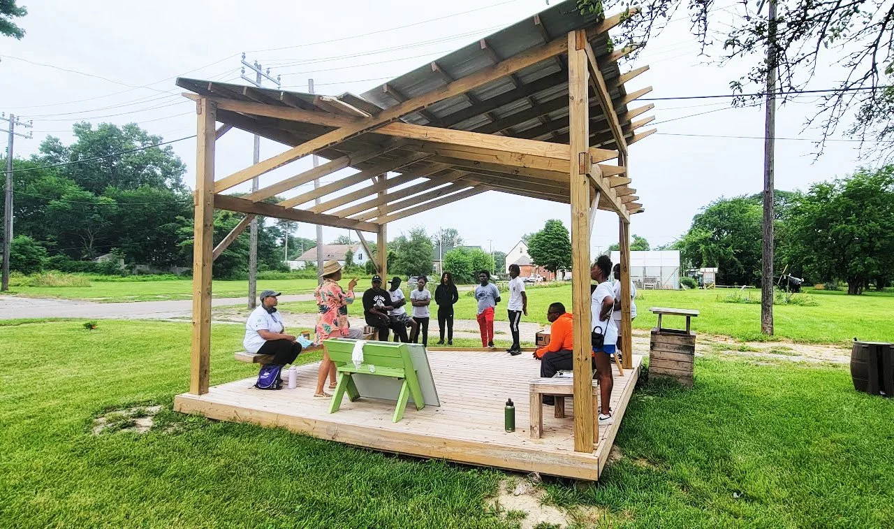 Through a collaborative design charrette between high school summer campers with Lawrence Tech and youth apprentices with Freedom Dreams, the re-creation of a vacant neighborhood lot into a recreational space through the realization of a small gathering pavilion. The structure is utilized by ComeUnity One Stop, an organization within Freedom Dreams founded and run by Jasmine Noble, a mental health counselor, whose goal is to provide wrap-around social services for families and youth.